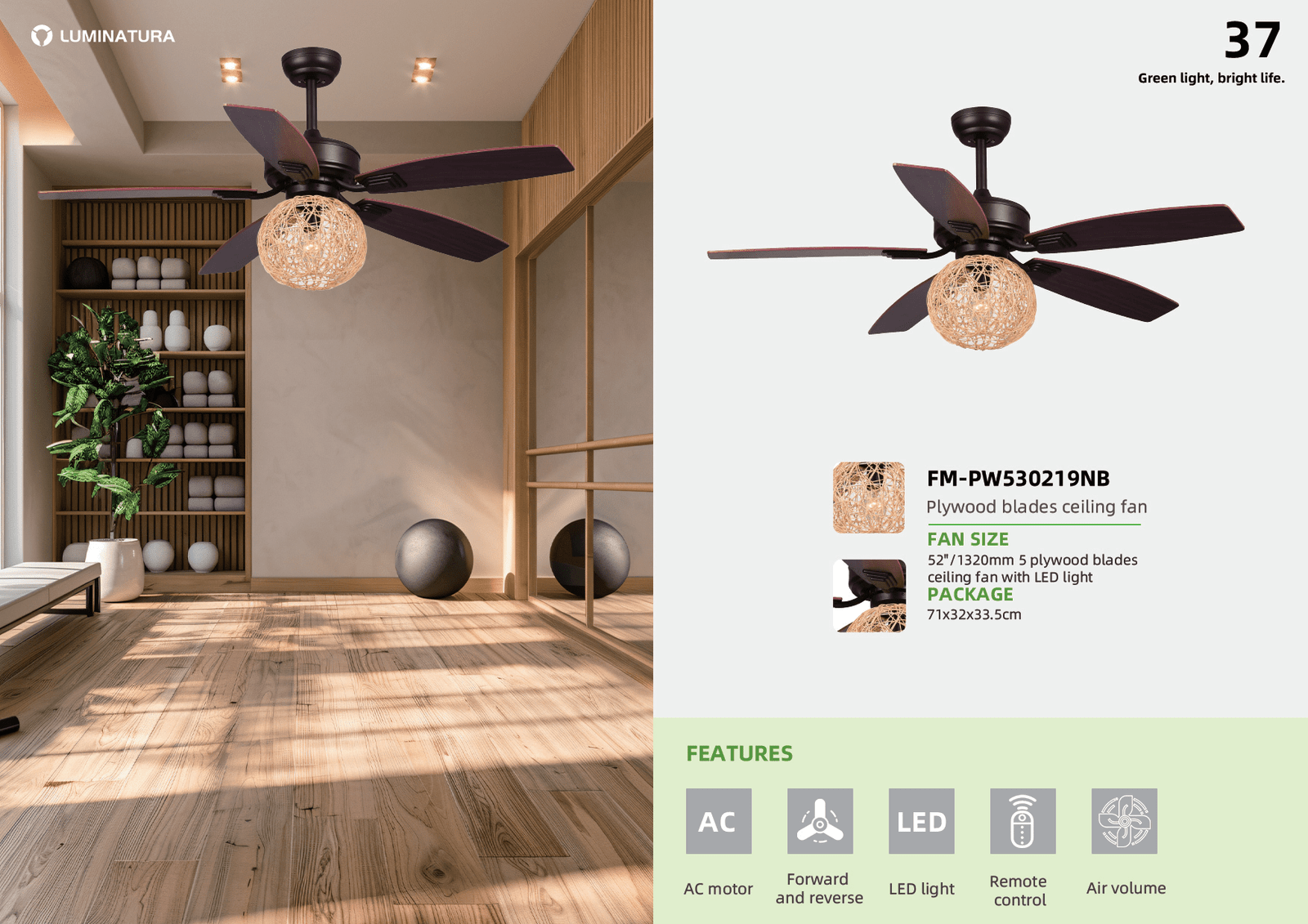 Ventilador de techo de 52″ con 5 aspas de plywood, incorpora un motor DC silencioso y eficiente, luz LED integrada, y control remoto. Ideal para optimizar la climatización y la iluminación en cualquier espacio.